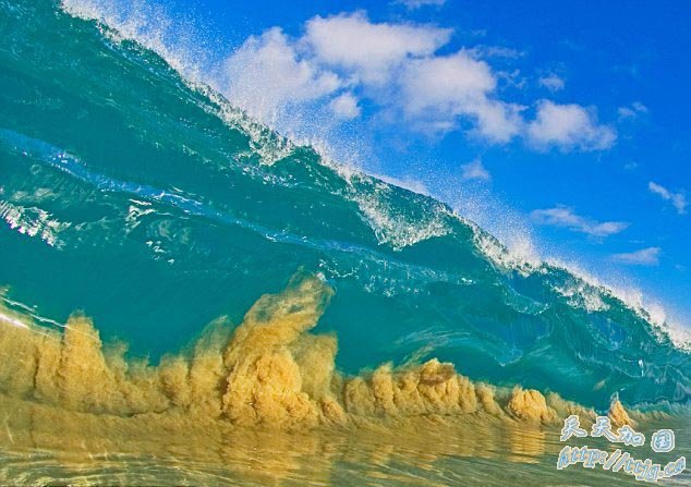 一股巨大的海浪开始冲击沙滩,金色的沙粒被自上而下的搅动,无休止地翻滚