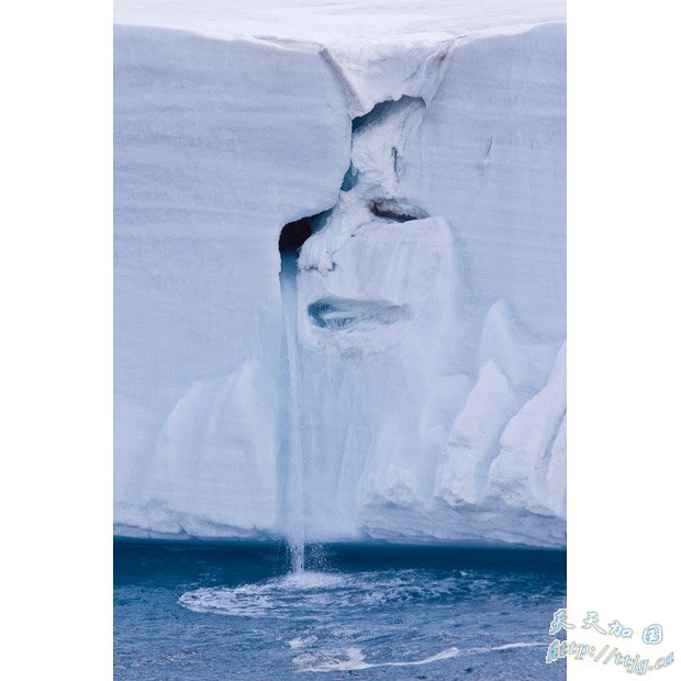 挪威北极地区冰川融化的照片,照片中融化的冰壁内出现了一张可怕的脸,融水成为这张令人恐怖的脸留下的伤心泪。