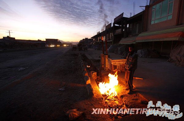 资料图片:阿富汗首都喀布尔的一名卖茶者站在路边的火堆旁取暖。新华社/路透