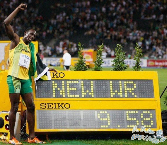 最快的百米飞人。在2008年北京奥运会上,牙买加田径选手尤塞安·圣莱奥·博尔特创造了一项新的世界纪录,他的百米速度为9.58秒。