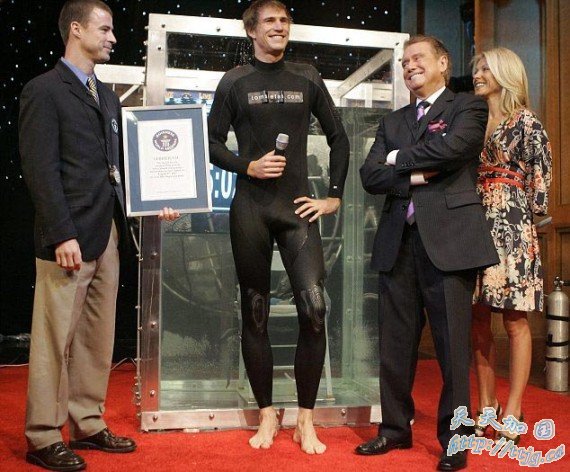水下憋气时间最长的人。2008年12月30日,来自德国汉堡的汤姆·西亚塔斯在西班牙马德里,创造了新的水下憋气时间最长记录,时长17分33秒,打破了由他人创造的世界纪录。