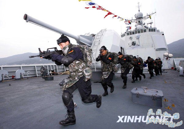 12月25日,海军特战队员在军舰上进行反海盗训练。新华社记者 查春明摄
