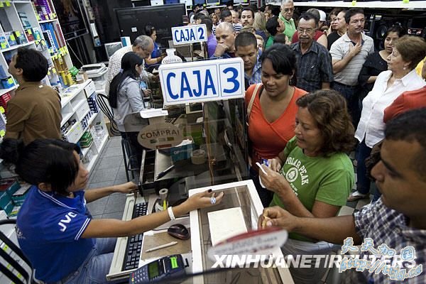 1月9日,在委内瑞拉首都加拉加斯的一个家用电器店,大批顾客在收款台前等候。当日,由于担心货币贬值导致进口商品物价上涨,当地大批居民来到家用电器商店抢购商品。委内瑞拉总统乌戈·查韦斯8日晚宣布,委内瑞拉货币玻利瓦尔对美元汇率从11日起贬值,同时施行“石油美元”与“重要进口产品”双轨制汇率:对于食品、医疗用品等关乎民生和经济生产的“重要进口产品”,汇率将从1美元兑换2.15玻利瓦尔变为1美元兑2.6玻利瓦尔;对于汽车、电信产品、家用电器等适用于“石油美元”的进口产品,汇率则将变为1美元兑4.3玻利瓦尔。新华社/路透