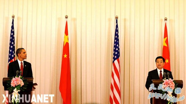11月17日,中国国家主席胡锦涛和美国总统奥巴马在北京人民大会堂共同会见中外记者。新华社记者李学仁摄