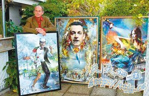 帕尔站在他创作的三幅巨幅画作前