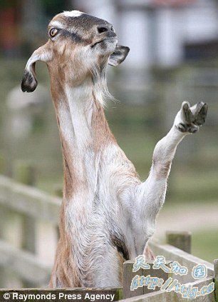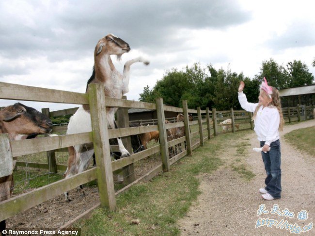 达伦正在向一位小“粉丝”挥舞前蹄告别。 据《每日邮报》1月11日报道,英国伯明翰一只“天才”山羊日前成了网络明星,它竟然会用蹄子与游客告别:当游客们向它挥手时,它就会用后肢直立起来,然后挥动前蹄。 这只雄性山羊名叫达伦,今年已经8岁,它是盎格鲁·努比亚山羊的混血后代,以前一直在诺丁汉郡法恩斯菲尔德的怀特·波斯特农场。直到2009年被主人安东尼·摩尔买下,它在电视纪录片《英国天才山羊》中,向“粉丝”挥蹄的姿态开始在 YouTube上广为流传,达伦的纪录片也在美国和澳大利亚电视台上播放。 2月份,达伦将在伯明翰与观众见面。但它的主人认为,过度曝光对达伦的健康不利。摩尔说:“他们想让达伦与著名流行音乐家西蒙·考威尔、媒体名人皮尔斯·摩根以及阿曼达·霍尔登等同台献艺。但对于一只山羊来说,这太难了,而且也违反动物福利政策。”