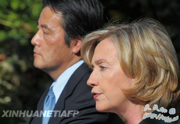 1月12日,美国国务卿希拉里·克林顿(右)在夏威夷与日本外务大臣冈田克也一同出席新闻发布会。希拉里当日在夏威夷与冈田克也举行会谈,驻日美军普天间基地搬迁问题成为两人讨论的焦点之一。但两人未能在会谈中解决这一困扰两国关系的问题。新华社/法新