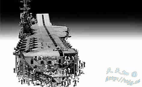 在航母的指挥控制中心———舰岛的前后,配备有运送飞机的升降梯。升降梯可将飞机从航母的机库中提升到甲板上。有媒体称,国产航母将配备30架舰载机,包括米格-29K以及舰载型国产轻型战斗机“光辉”。航母将拥有两条200米跑道,以及一块直升机停放甲板,共配备1600名海军官兵。