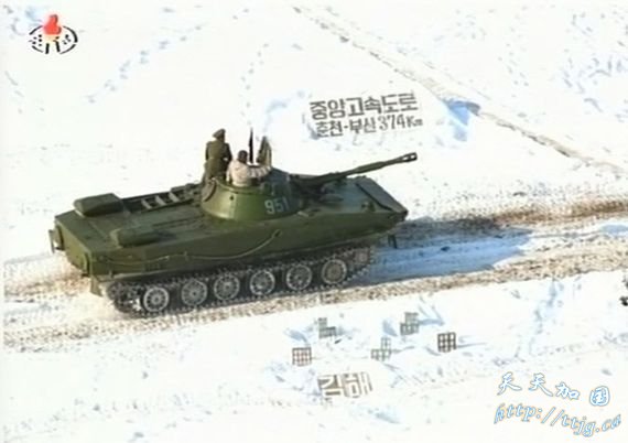 朝鲜坦克训练场景图片,上面的文字为韩国地名
