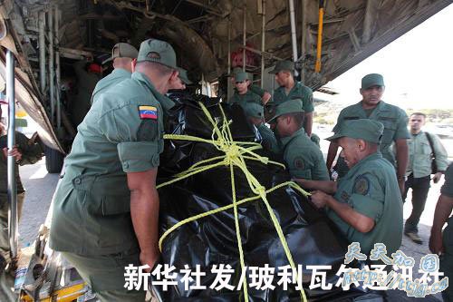 1月15日,在委内瑞拉迈克蒂亚的国际机场,委内瑞拉军人将救灾物资搬运上飞机。当日,委内瑞拉支援海地地震灾区的第二批救援人员携带救灾物资奔赴海地。第二批救援人员共29人,其中包括25名军方人员、2名地震专家和2名民防专家。新华社发/玻利瓦尔通讯社