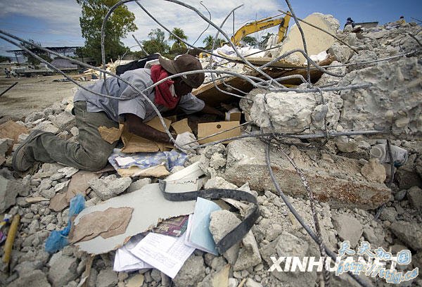 1月14日,在海地首都太子港,一个人在清理废墟。海地当地时间12日下午发生强烈地震和多起余震,造成首都太子港大量房屋受损或倒塌,当地人士称地震可能造成数万人死亡。新华社记者戴维摄