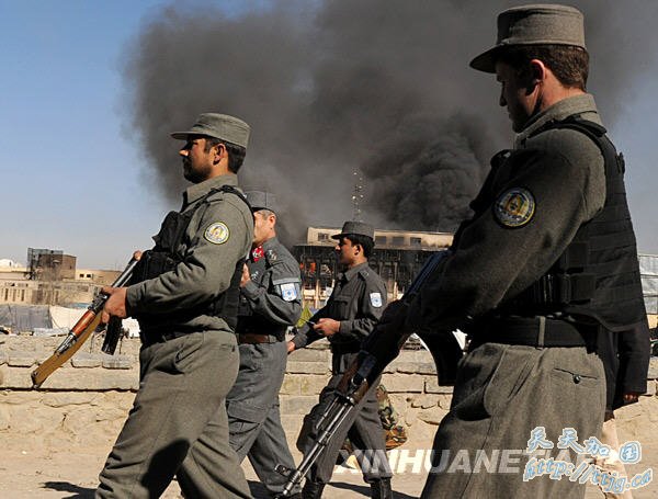 1月18日,在阿富汗首都喀布尔,警察在一座燃烧的建筑前巡逻。一伙武装分子18日上午潜入阿富汗首都喀布尔市中心发起爆炸袭击,并与警方发生枪战。新华社/法新