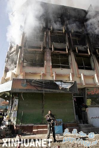 1月18日,在阿富汗首都喀布尔,士兵在一座起火的购物中心前守卫。塔利班武装分子18日上午潜入阿富汗首都喀布尔市中心地带发起爆炸袭击,并与阿警方发生枪战,造成至少6人死亡、10多人受伤。 新华社发(扎比摄)