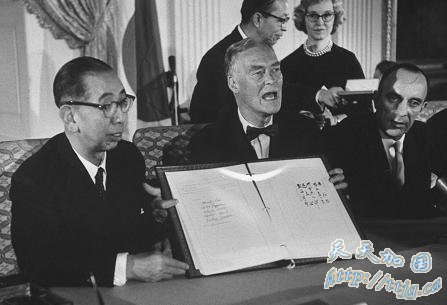 1960年,时任日相岸信介(左)和时任美国国务卿霍特签订条约。