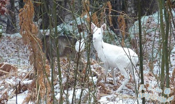白化小鹿紧跟着母亲,意大利政府规定猎人不能狩猎白化鹿