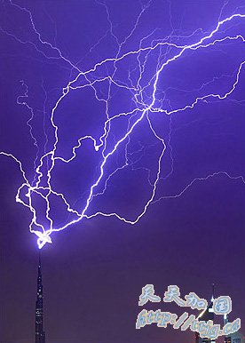 上面这张令人震惊的照片展示了世界最高建筑哈利法塔遭闪电击中时的场面。