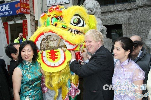 没有警卫,不带保镖,伦敦市长鲍里斯·约翰逊如同往常一样骑着单车,二十二日上午冒着蒙蒙细雨来到伦敦华埠,手举中国传统的舞狮狮头,用汉语预祝华人中国虎年春节“新年快乐”。