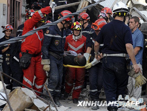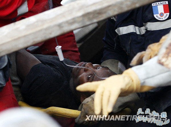 1月23日,在海地首都太子港,国际救援人员解救出威斯蒙德·厄安图斯。海地地震11天后,救援人员在首都太子港一座酒店废墟下成功解救出一名23岁男子。这名目前身体状况良好的男子被救出时还说了一句“谢谢”。新华社/法新 新华网太子港1月23日电 海地地震过去11天,一名男子23日被救援人员从首都太子港一处废墟下成功救出。他此前被困在一家酒店的废墟下,但有一定活动空间。 这名20多岁的男子名叫威斯蒙德·厄安图斯。他被救出时身体状况良好,还对救援人员说了一声“谢谢”。厄安图斯被困的废墟是酒店内的杂货店。他说,地震发生时他躲在一张书桌下,之后一直躺在那里,靠喝可乐吃饼干维持生命。 厄安图斯的兄弟将救援人员带到了他所在的废墟处。救援人员说,他被埋在5米多深的废墟中,救援者先挖开一条通道,之后两名救援人员从通道中进入,将他救出。 海地政府22日下午宣布人员搜救告一段落,但一些搜救人员还在努力寻找生命奇迹。强烈地震发生后11天来,国际搜救队先后从废墟中总共救出130多名幸存者。 |