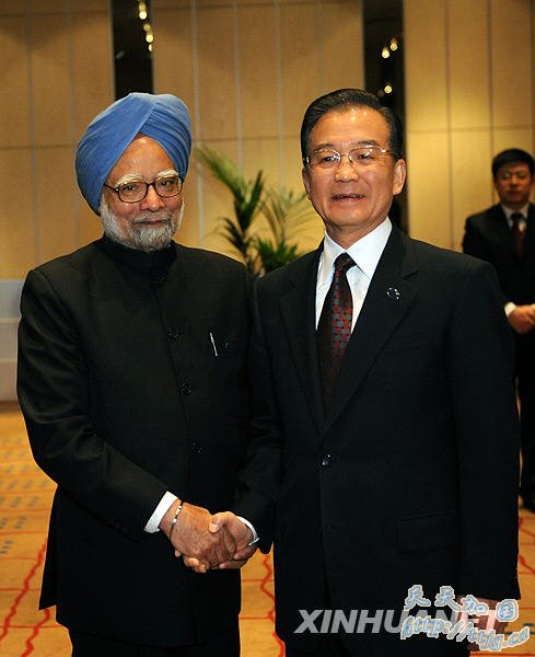 12月18日,中国国务院总理温家宝在哥本哈根会见印度总理辛格。新华社记者刘建生摄