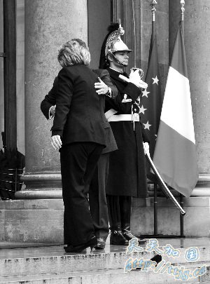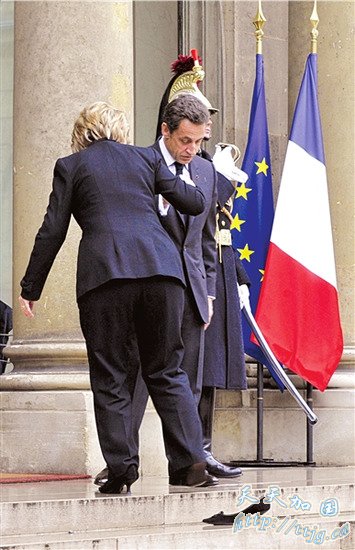希拉里高跟鞋掉在台阶上。 萨科齐扶住掉了鞋的希拉里。 29日,法国爱丽舍宫,萨科齐扶...
