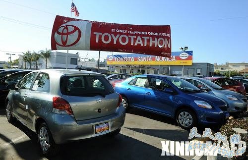 2010年2月3日,美国加利福尼亚州圣莫尼卡的一个丰田汽车公司经销商的销售点。美国运输部长雷蒙德·拉胡德3日继续就油门踏板问题向日本丰田汽车公司施压,他说他将就此问题直接和丰田总裁丰田章男接触,并向后者表达严重关切。 新华社/法新
