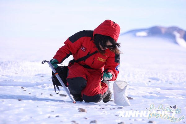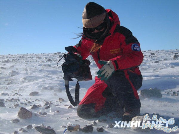 这是新华社女记者崔静在冰面上采集陨石。作为一名考察队员,崔静白天要协助其他队员完成陨石收集、地质采样、冰下地形探测等野外考察任务,晚上写稿、传稿。新华社发