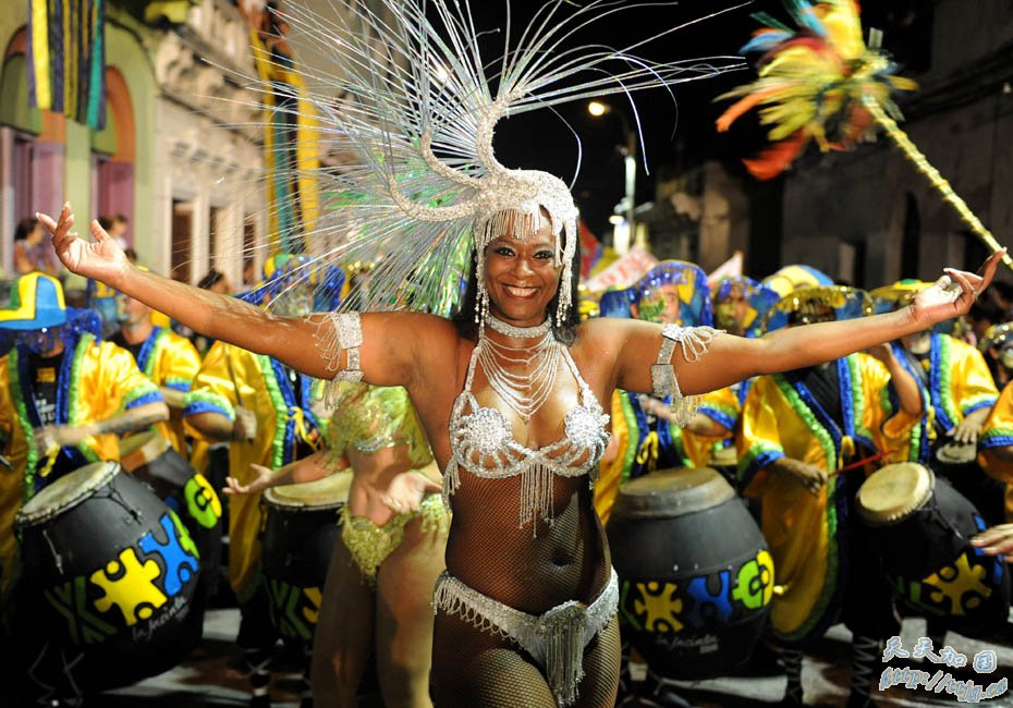演员们在乌拉圭首都蒙得维的亚参加狂欢节“召唤”巡游表演。