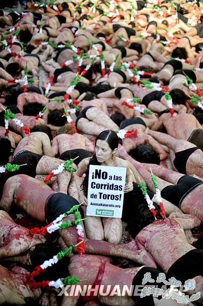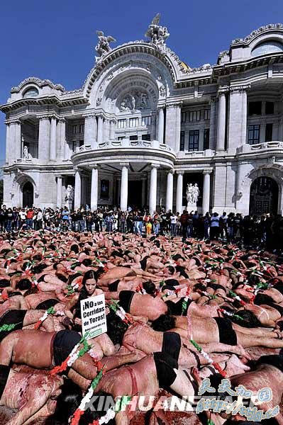 2月6日,墨西哥一个动物保护主义组织成员在墨西哥城举行静卧抗议活动,反对斗牛。标语上写“不要斗牛!”
