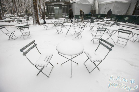 美国纽约布莱恩公园的桌椅被白雪覆盖。