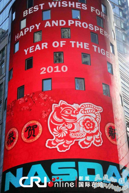为庆祝中国传统新春佳节的到来,纽约纳斯达克股票交易所自12日下午起,在位于时代广场总部大楼外的巨幅显示屏上将不定时循环展示庆祝中国春节的图片。