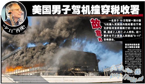 一名男子18日驾驶一架小型飞机撞入美国国内税收署位于得克萨斯州首府奥斯汀的一处办公楼,造成2人死亡、2人受伤。这一事件令不少美国人回想起“9·11”恐怖袭击。