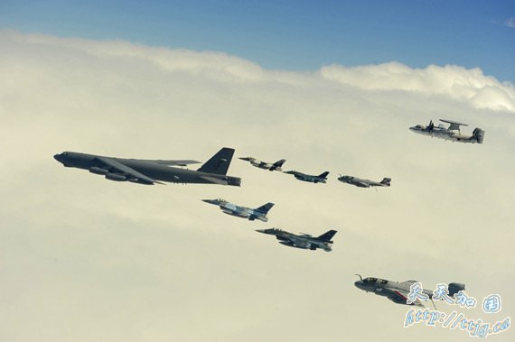 2月15日,美日空军派出B-52H战略轰炸机、入侵者中队F-16C、F-2A、EA-6B电子战干扰机、E-2C预警机进行空中力量展示。
