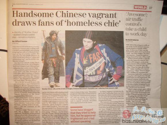 4日,“犀利哥”的照片登上了英国《独立报》的报端。该报报道说,这名非常英俊的中国男子像模特那样有节奏地走路。他穿着破烂,但很好地把一件大衣套在了皮夹克的外面。他的眼神刺向远处,粉丝将其描述为“深沉而又敏锐”。此外,他大踏步走路时显得非常自信。