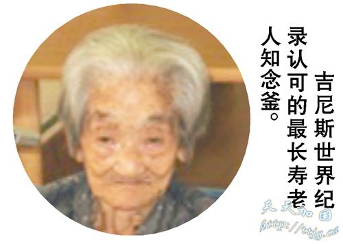 目前,经过吉尼斯世界纪录认可的全球在世最长寿老人是日本冲绳县妇女知念釜,出生于1895年5月10日,今年115岁。已知的世界第二长寿老人、美国的玛丽·约瑟芬·雷于7日刚刚去世,活了114年294天。