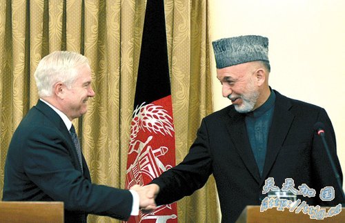 资料图片:美国国防部长罗伯特·盖茨8日上午突访阿富汗,与阿总统哈米德·卡尔扎伊会面