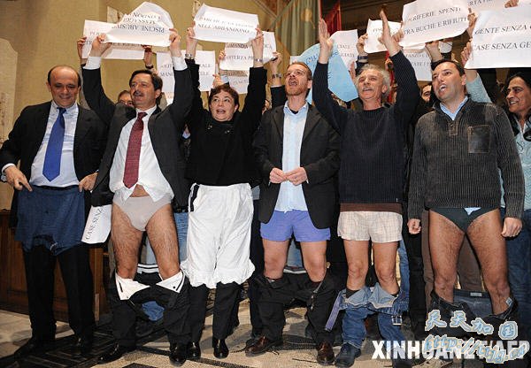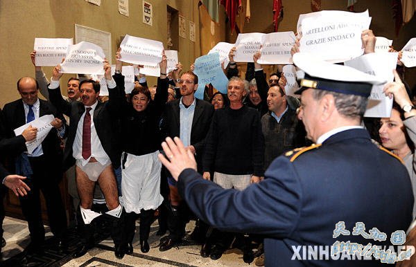 3月15日,在意大利首都罗马,来自左翼政党的市政官员在市政厅以脱裤子方式表达不满。罗马大约50名来自左翼政党的市政官员当日聚集到市政厅,以脱裤子方式呼吁来自中右翼政党自由人民党的罗马市长詹尼·阿莱曼诺尽快通过本市2010财政年度预算。新华社/法新
