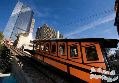 这是3月16日在美国洛杉矶拍摄的正在运行的“天使航班”(Angels Flight)。位于美国加州洛杉矶市中心的“天使航班”(Angels Flight)被称为世界上运营里程最段的铁路,全长99米,沿着一个坡度为33%的山丘而建,有两个可以分别容纳25人的车厢运送上下山丘的乘客。“天使航班”于1901年开始运营,最初运营的单程车费为1美分,目前是25美分。“天使航班”曾经在2001年因故停运,直至今年3月15日恢复运营,再次成为当地观光旅游的景点。新华社