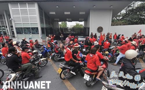几小时后,数千名红衫军示威者又在美国驻曼谷使馆前集会,他们称,此举旨在告诉国际社会,阿披实政府是不合法的。红衫军领导人加图蓬还进入了美国使馆,与美国外交官进行了交谈。示威者还向美国和英国驻曼谷使馆递交了信件,以寻求国际社会支持其解散议会、提前举行大选的要求。“红衫军”主要成员是农民和社会底层人员,是前总理他信的坚定支持者,他们指责现政府代表富人阶层的利益。
