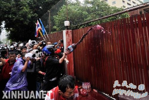 3月17日,泰国“红衫军”在总理阿披实位于曼谷的住宅前泼洒血液。当日中午,支持泰国前总理他信的“红衫军”在总理阿披实住宅前泼洒血液,继续向政府施压,要求解散国会下议院。 新华社记者吕小炜摄