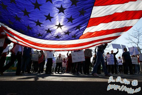 2010年3月19日,美国弗吉尼亚州费尔法克斯,奥巴马政府医改法案的反对者在乔治梅森大学外进行示威抗议。奥巴马将在这里就医改法案发表演讲。