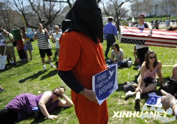 3月20日,一名男子穿着美军囚服在美国首都华盛顿白宫外参加反战集会。当天,数百名美国民众聚集在华盛顿白宫外举行反战集会,纪念伊拉克战争7周年,并要求美国从伊拉克和阿富汗撤军。新华社记者张军摄