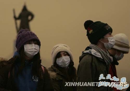 3月20日,在韩国首都首尔,天空被沙尘覆盖,人们戴着口罩在一个广场上行走。当天晚间,韩国气象部门发布了沙尘黄色预警信号。新华社/路透