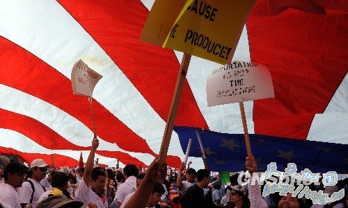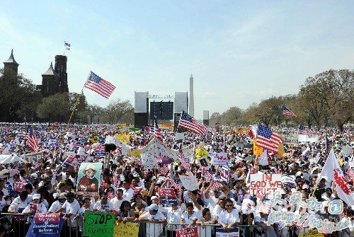 21日,正当美国众议院就奥巴马力推的医疗改革法案做最后投票时,国会山前云集了从全美各地汇聚而来的约十万移民,他们高举标语,高呼口号,希望引起奥巴马和国会的注意,推动搁置良久的移民改革,让1200万非法移民合法化。