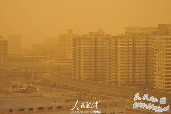 20日的北京,人们一觉醒来,都惊讶地发现整个天空呈现奇异的明黄色。强浮尘天气从昨夜开始横扫京城,马路上、汽车上、自行车甚至花草树木上都附着一层明 显的黄沙。