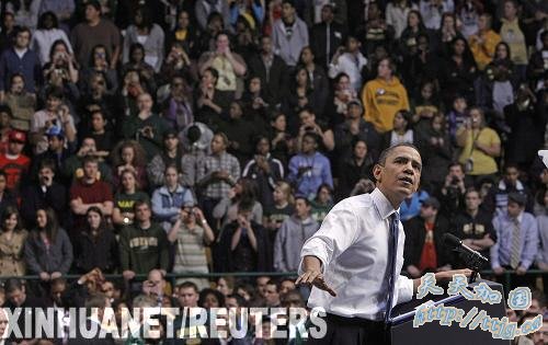 3月19日,美国总统奥巴马在弗吉尼亚州乔治·梅森大学就医改问题发表演讲。美国国会众议院即将就最终版本医改议案进行投票,奥巴马总统19日为医改进行最后的宣传造势。新华社/路透