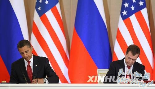 资料图:2009年7月6日,在俄罗斯首都莫斯科,俄罗斯总统梅德韦杰夫与美国总统奥巴马在签字仪式上签署文件。当日,俄美双方通过了关于反导问题、核领域合作、阿富汗问题等联合声明。新华社记者鲁金博摄