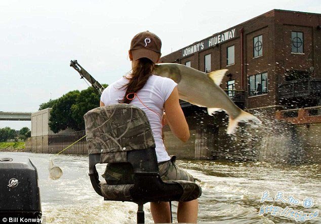 这张别有趣味的照片是在伊利诺伊河水库拍到的。伊利诺伊河水库是亚洲鲤鱼聚集的地方,这种鲤鱼非常具有攻击性。当时,小船驶近,许多亚洲鲤鱼跳出水面,船上的人于是萌发了用弓箭射击鱼的想法。