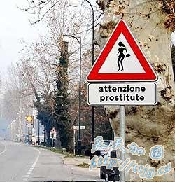 据伦敦每日电讯报报道,意大利北方城市特勒维索市公路上有个框着红色边边的三角形路标,上面画着一名穿着清凉的女子,手上还提着手提包,路标上写着“注意妓女” (Attenzione Prostitute),似乎要警告人们此区有妓女出没。