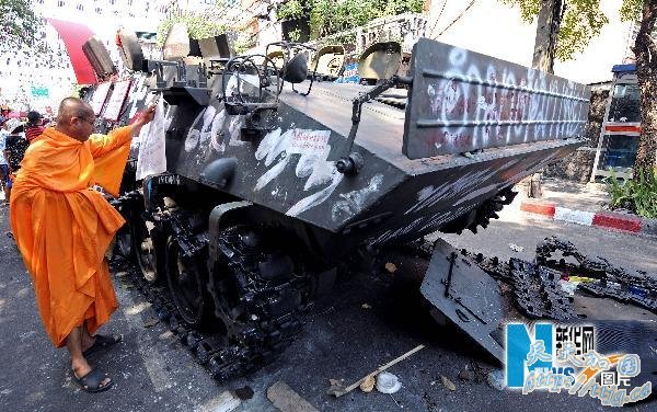 4月14日,在泰国首都曼谷市中心,一名僧人站在被砸坏的一辆军车旁观看。泰国军警与支持前总理他信的“红衫军”10日在曼谷冲突中的两名受伤者死亡,使得这一冲突造成的死亡人数增至23人。 新华社/法新