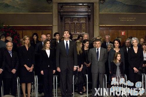 4月22日,西班牙王储费利佩(左四)携王妃莱蒂西亚(左三)出席遗体告别仪式。当日,国际奥委会终身名誉主席萨马兰奇的遗体告别仪式在西班牙巴塞罗那举行。 新华社发 (巴克摄)